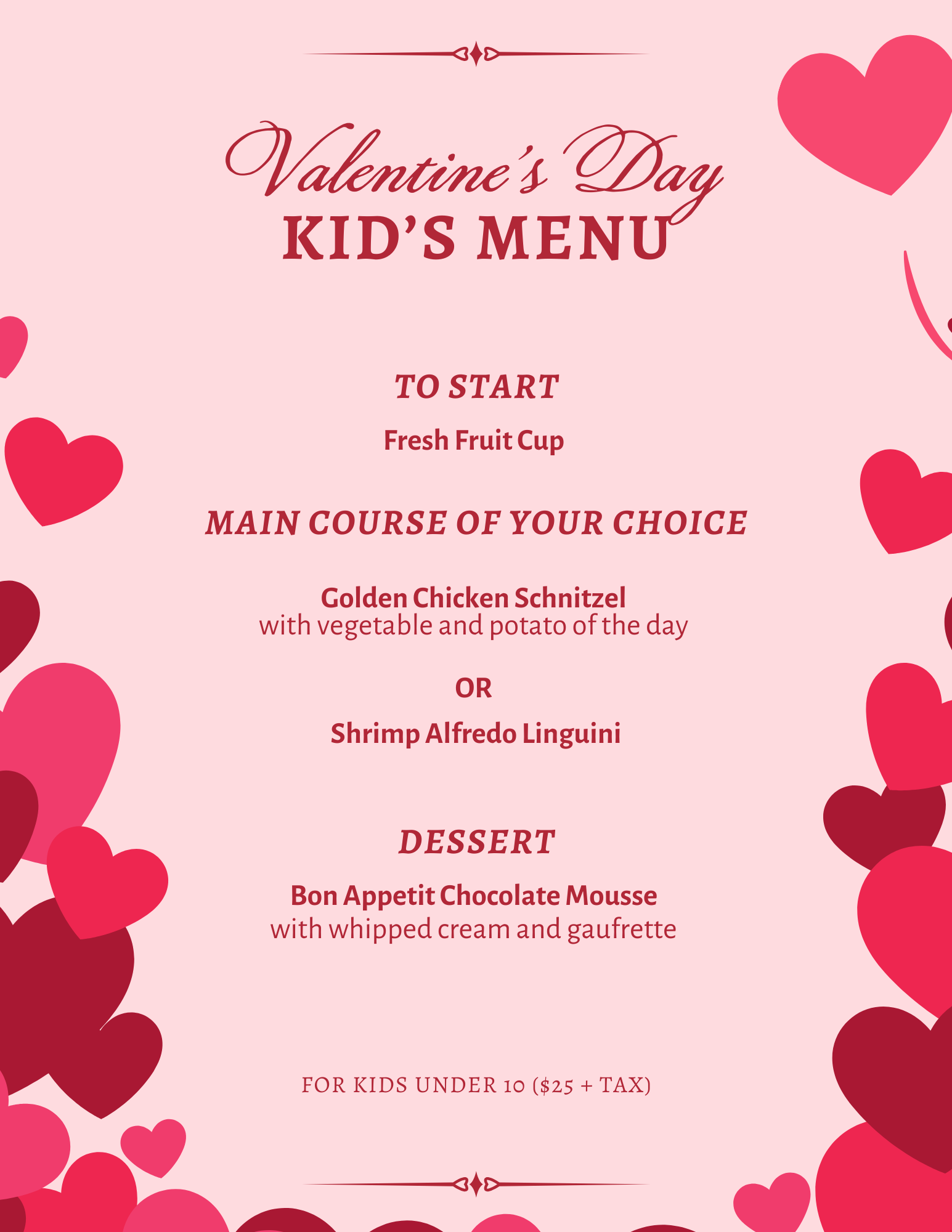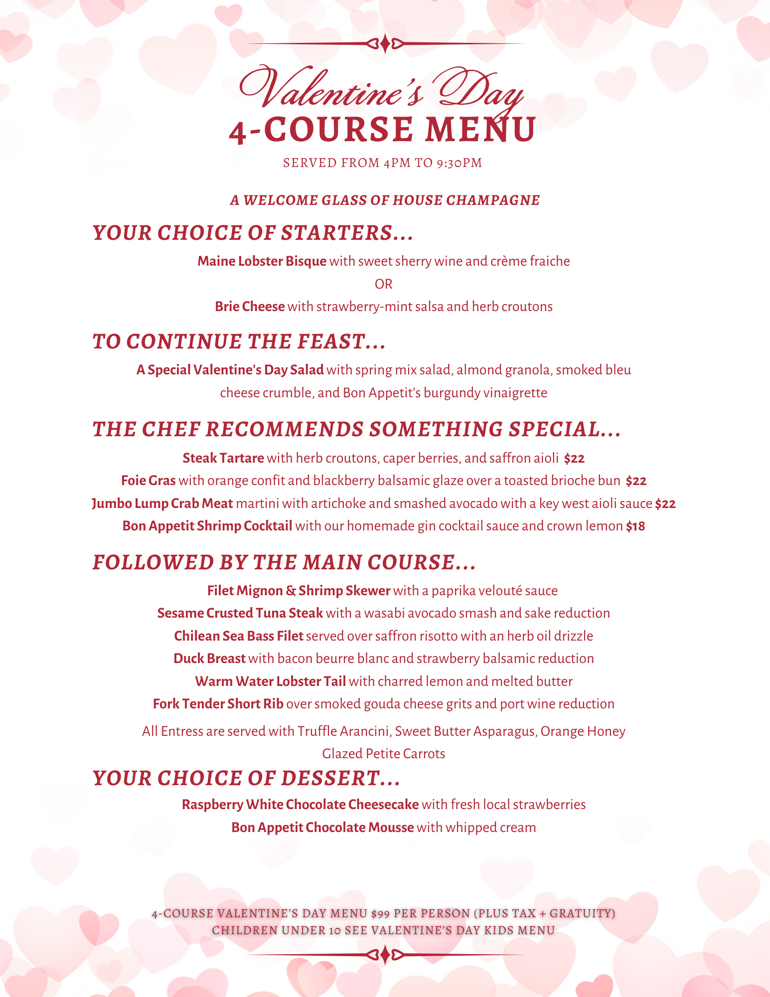 A complimentary glass of house champagne will be offered to start the Valentine’s Day 4-Course Dinner experience.
